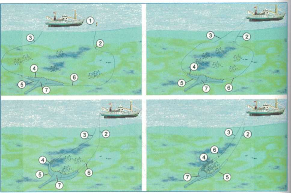 Разноглубинным тралом вылавливают таких рыб как навага, треска, минтай, скумбрия и так далее.
