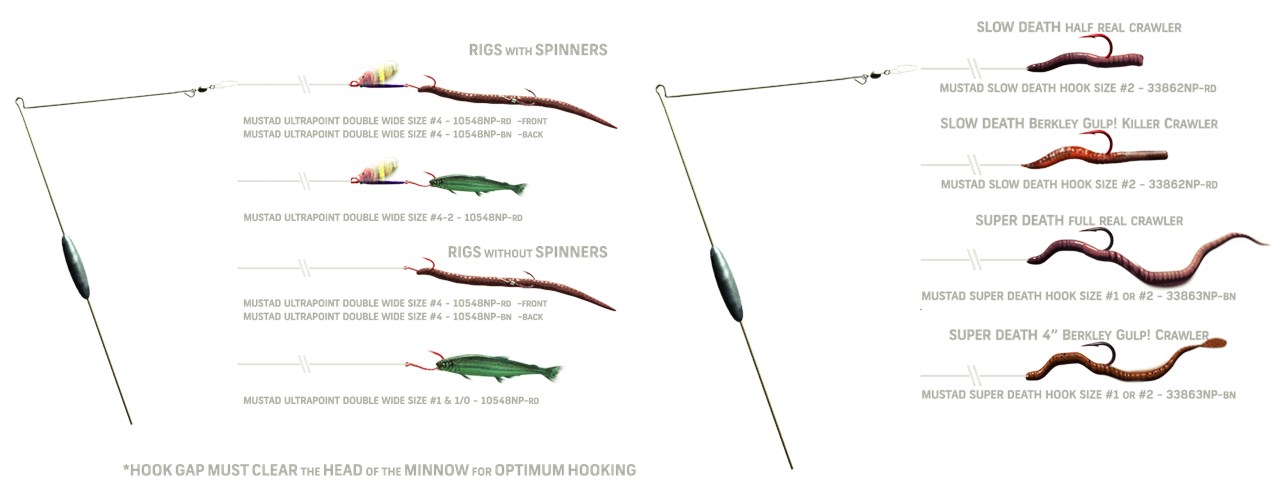 Наши американские коллеги успешно ловят на оснастку bottom bouncer, представляющую собой L-образное коромысло из проволоки, на длинном конце которого закреплён груз-оливка (его вес зависит от глубины — на каждый метр должно приходиться не менее 10 г). У нас, такую оснастку называют «балерина».
