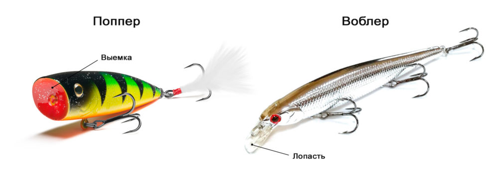 - Главное отличие попперов от воблеров в форме носовой части: первые имеют выемку в форме широко раскрытого рыбьего рта, вторые в виде плоской лопасти (см. фото ниже);