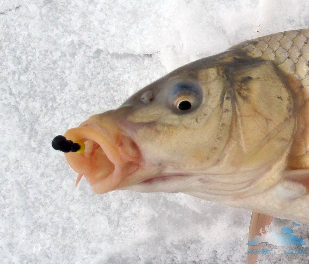 Важно подбирать варианты с максимально острым жалом и коротким цевьем.. При ловле карпа рекомендуется площадку вокруг лунки затемнить, сделать это можно сухой травой, саму лунку можно присыпать снегом, это исключит не только попадание света в нее, но и предотвратит быстрое замерзание воды