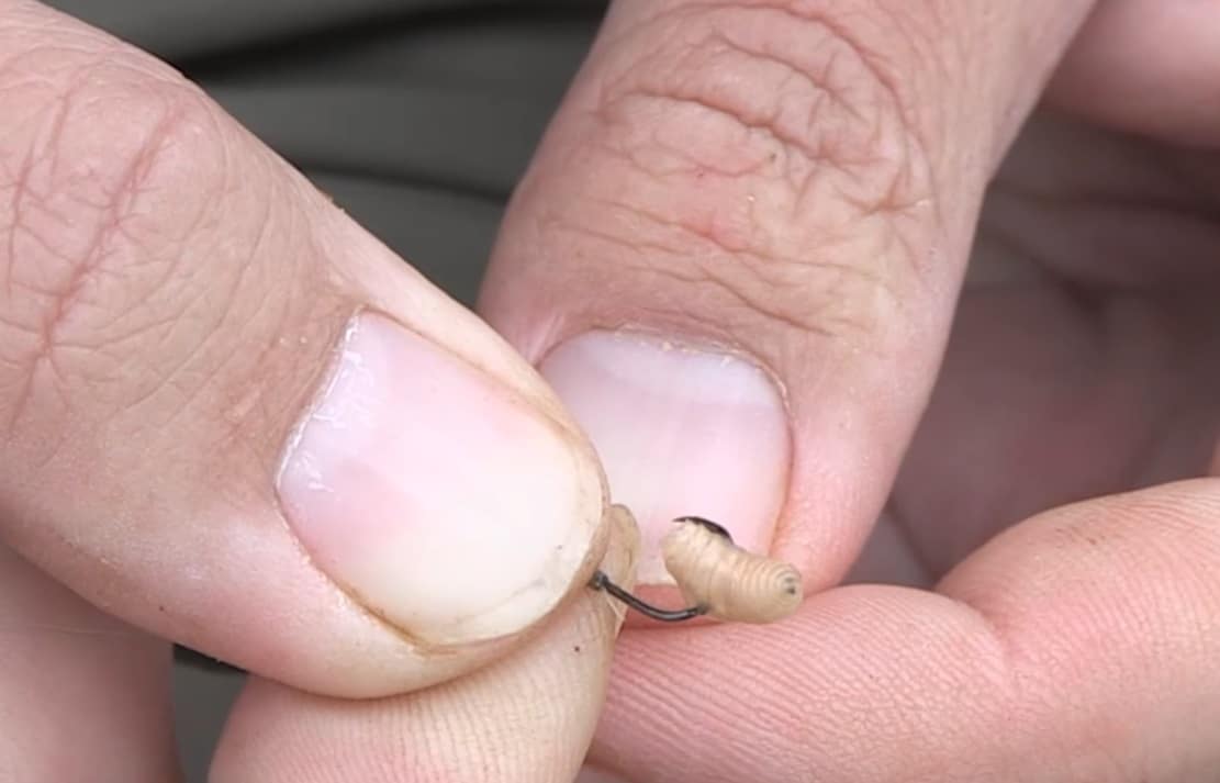 Чтобы поймать такую крупную рыбу, как карп, необходимо надежно зафиксировать наживку, чтобы добыча не смогла быстро сорваться с крючка. Насадить опарыша можно так: