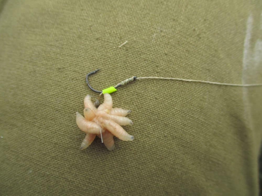 Пучок опарышей, насаженных на крючок, отлично работает при ловли более крупной рыбы: