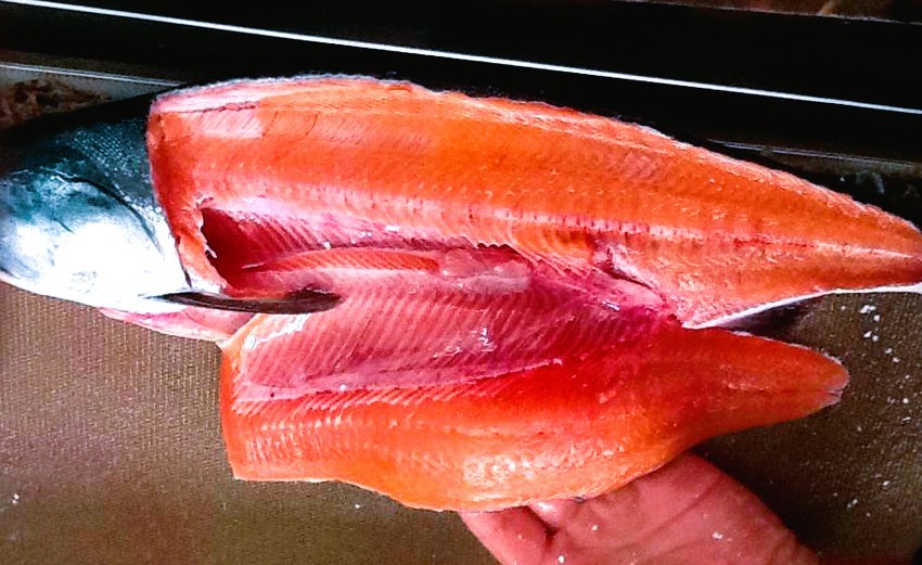 Тушка нерки разделывается, чтобы осталось одно мясо, без кожи и костей.