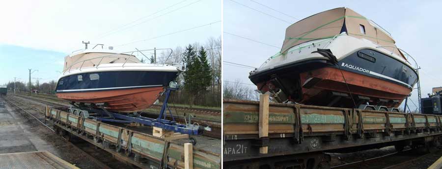 При подходящих габаритах судно можно погрузить с помощью спецтехники в вагон и перевезти в нужный пункт. Металлический контейнер надежно защитит катер от повреждений, да и препятствий на ж/д путях куда уж меньше, чем на автотрассах. Но у такого способа есть два существенных минуса: