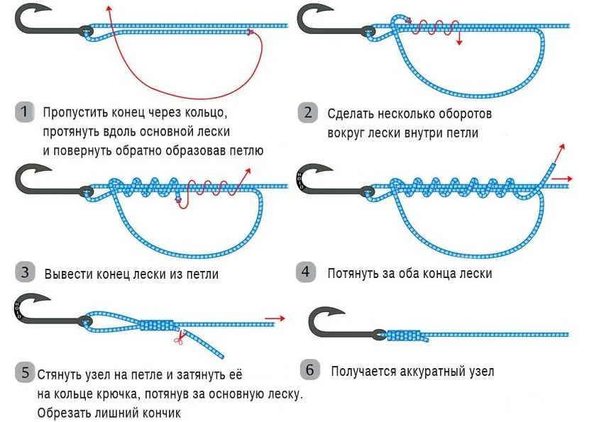 Такой вариант завязывания очень простой и освоить его может даже начинающий рыболов. Кроме того, он не требует много времени и вполне приемлем для использования прямо на рыбалке. Это может быть в тех случаях, когда необходимо оборудовать удилище не в домашних условиях.