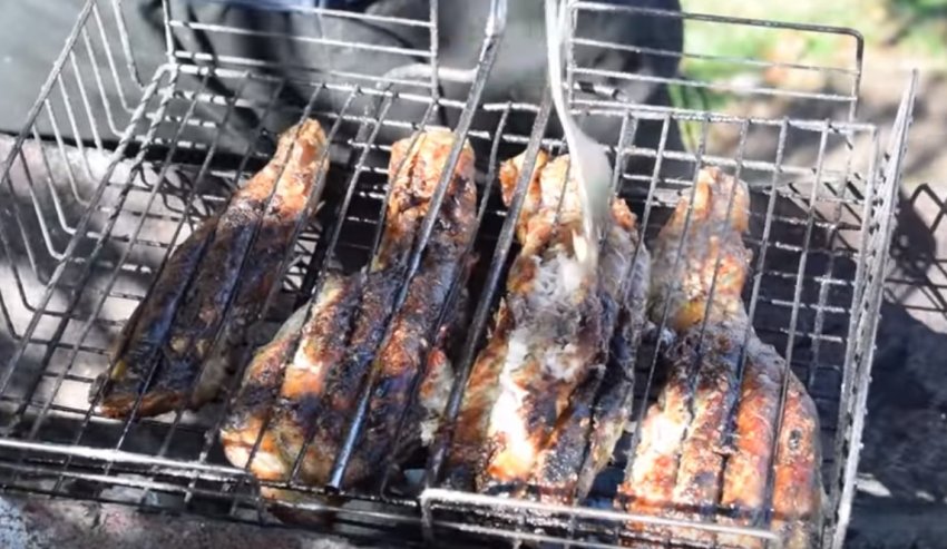 - Положите решетку с лещом на мангал. Жарьте его 40 минут, периодически переворачивая решетку.
