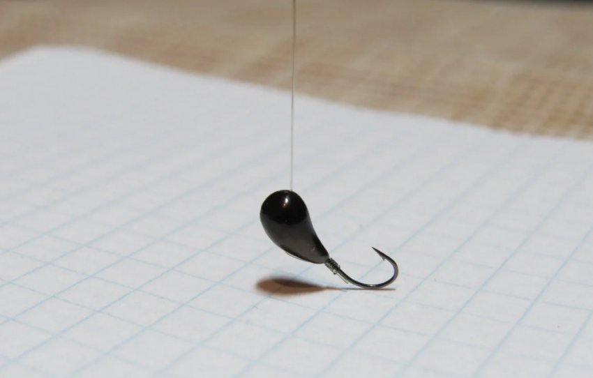 - Вначале часть лески продевается в отверстие в теле мормышки, за край которого (примерно на десять сантиментов) выходит окончание отрезка; крючок должен быть направлен вверх.