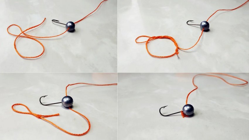 Безнасадочная приманка крепится к нити узлом, который нужно завязывать по такому алгоритму: