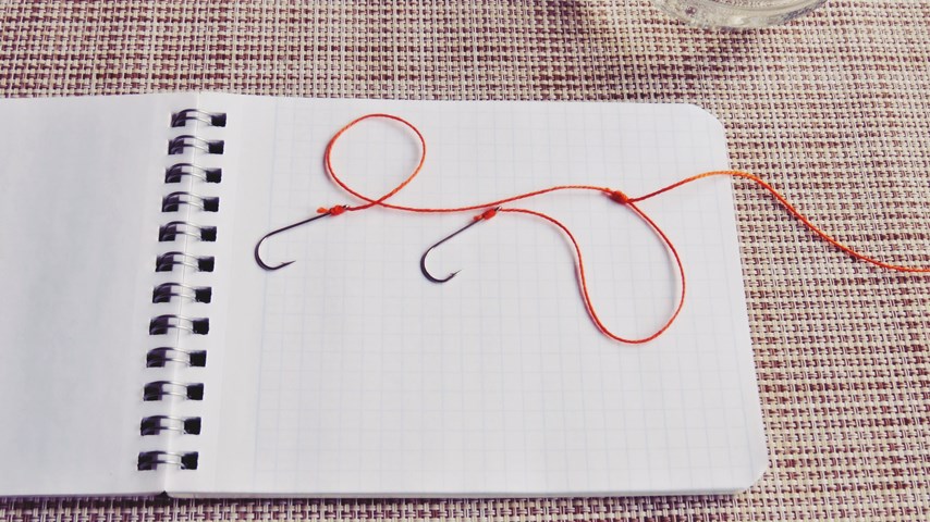 - После этого макаем пальцы в воду, а потом смазываем ей получившийся узелок. Ни оторвать, ни отвязать крючок не получится! Второй крючок крепится точно так же, только его поводок нужно привязывать на определённом расстоянии от первого, чтобы не было перехлёста.