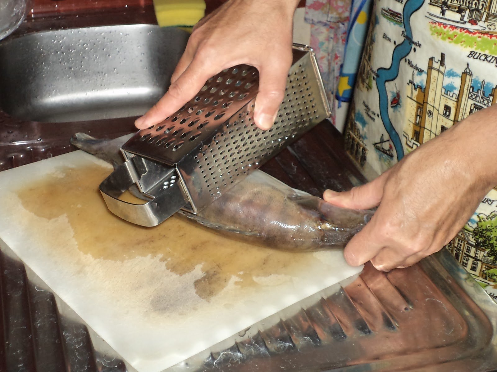 Один из самых эффективных и быстрых способов очистки рыбы от чешуи, это чистка при помощи тёрки. Для такого метода используем тёрку с 4 рёбрами, она более удобна в применении.