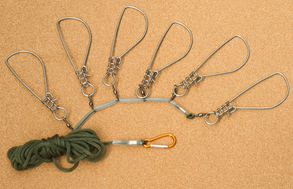 Карабины прикреплены к основному шнуру через вертлюги. Их конструкция бывает разной, но все они сделаны так, что сойти с них рыба не может ни при каких условиях.