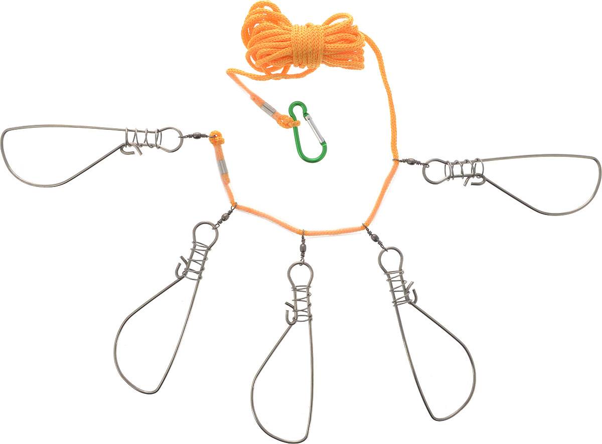 Кукан Акара 8411014 крепится на синтетической веревке. К одному концу троса прикреплен небольшой карабин, чтобы прикрепить кукан к берегу или к уключине лодки. 5 металлических зажимов для рыбы прикреплены к тросу с помощью металлических антабок.