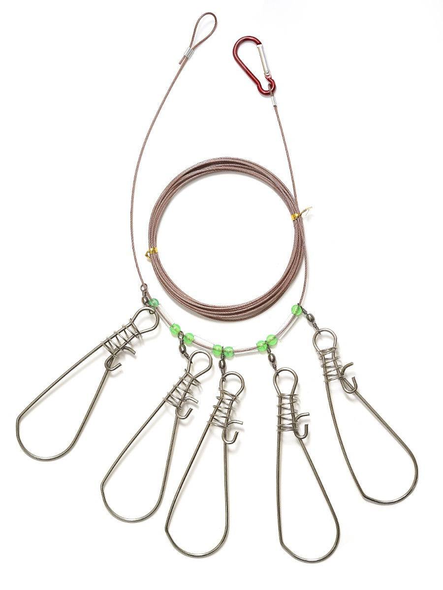 Кукан Fish2Fish изготовлен на основе металлического троса. К одному концу троса прикреплен металлический карабин, с помощью которого кукан можно закрепить на берегу или на уключине лодки. На другом конце кабеля находится поплавок, который указывает положение повара в воде. У Кукана есть катушка, на которую удобно наматывать металлический трос. 5 металлических зажимов для рыбы прикреплены к тросу с помощью металлических антабок.