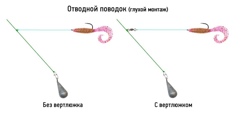 Глухой метод монтажа отводного поводка считается самым простым. Груз закрепляется на конце основной лески, а на высоте 30 см от груза формируется петля. Именно к ней крепится поводок, к которому присоединяется крючок. Также в петлю можно добавить ветлюжок, для крутящихся приманок, что улучшит их поведение в воде.