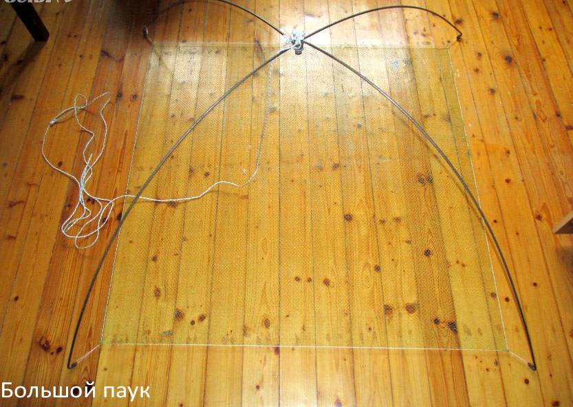 При изготовлении паука даже необязательно использовать металлические детали. Если сеть небольшая, то достаточно и гибких деревянных прутьев, но когда в такой рыболовный подъемник попадет более или менее серьезный улов, это может закончиться поломкой снасти. А для того, чтобы наловить живца, хватит и такой ненадежной конструкции.