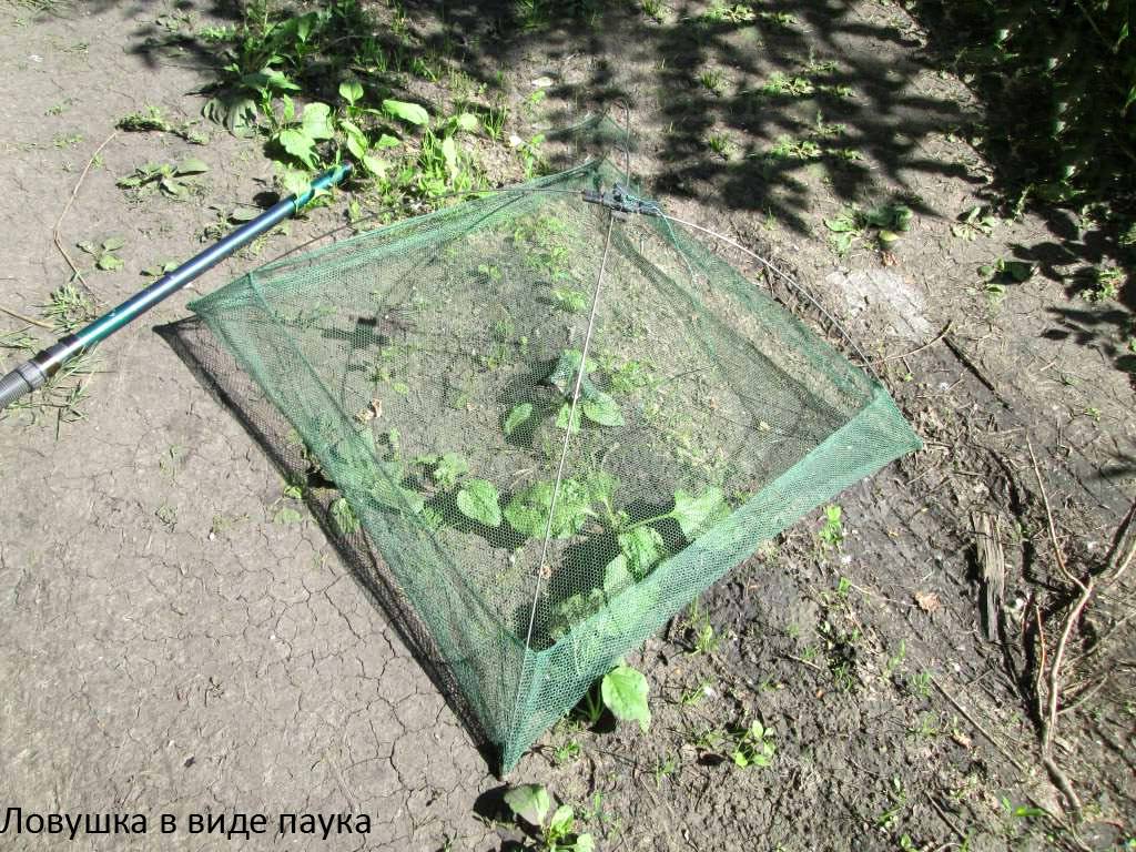 На подобном принципе основана рыбалка и на молодняк с помощью маленького «паука». Только в этом случае вместо сетки берут домашнюю тюль, и в момент, когда рыба заплывет в центр ловушки, останется только потянуть веревку и вытащить добычу.