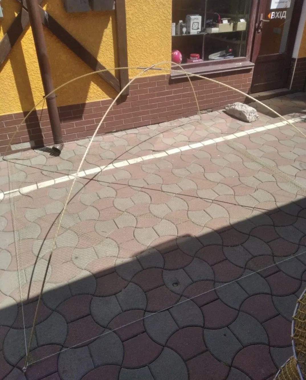 - Потом прутья монтируют к крестовине так, чтобы при креплении прута в отверстие трубочки на полотнище образовалось наподобие кулька (сетка слегка провисала).