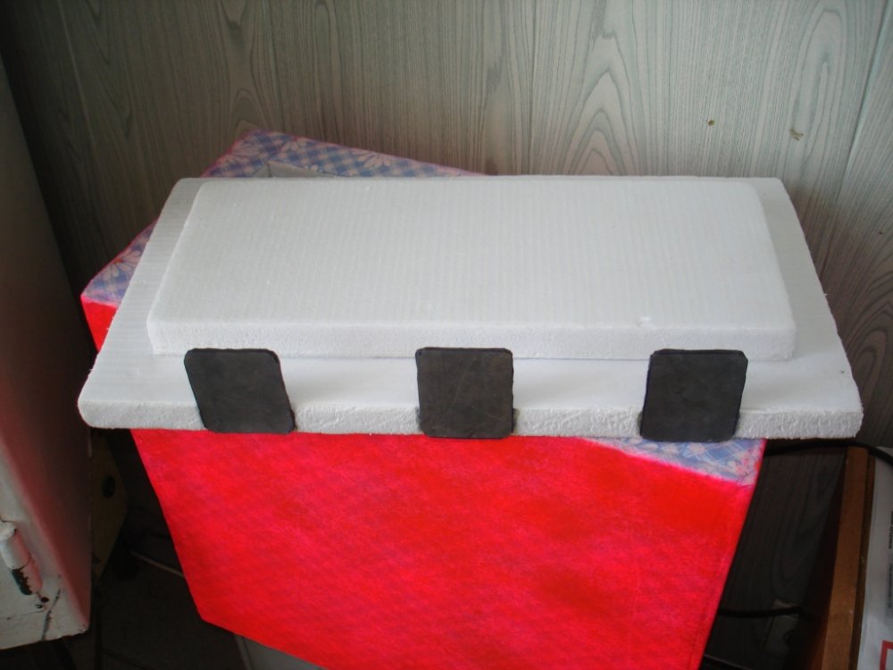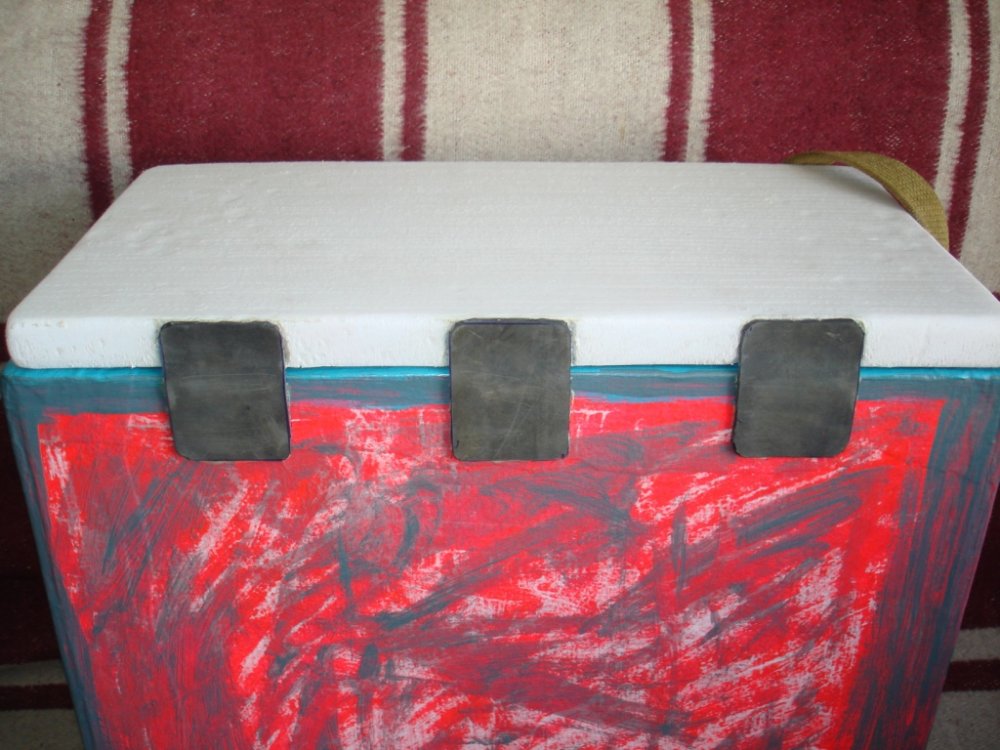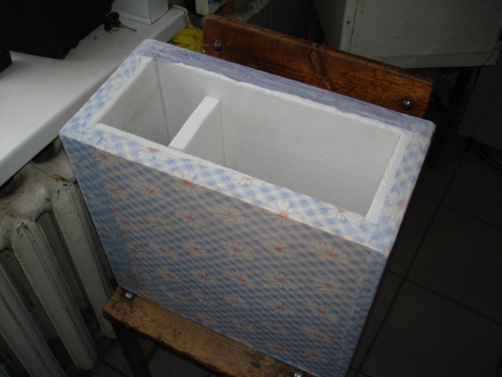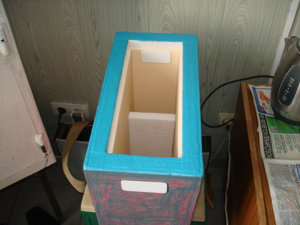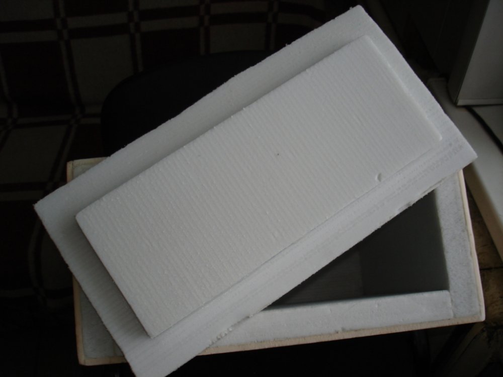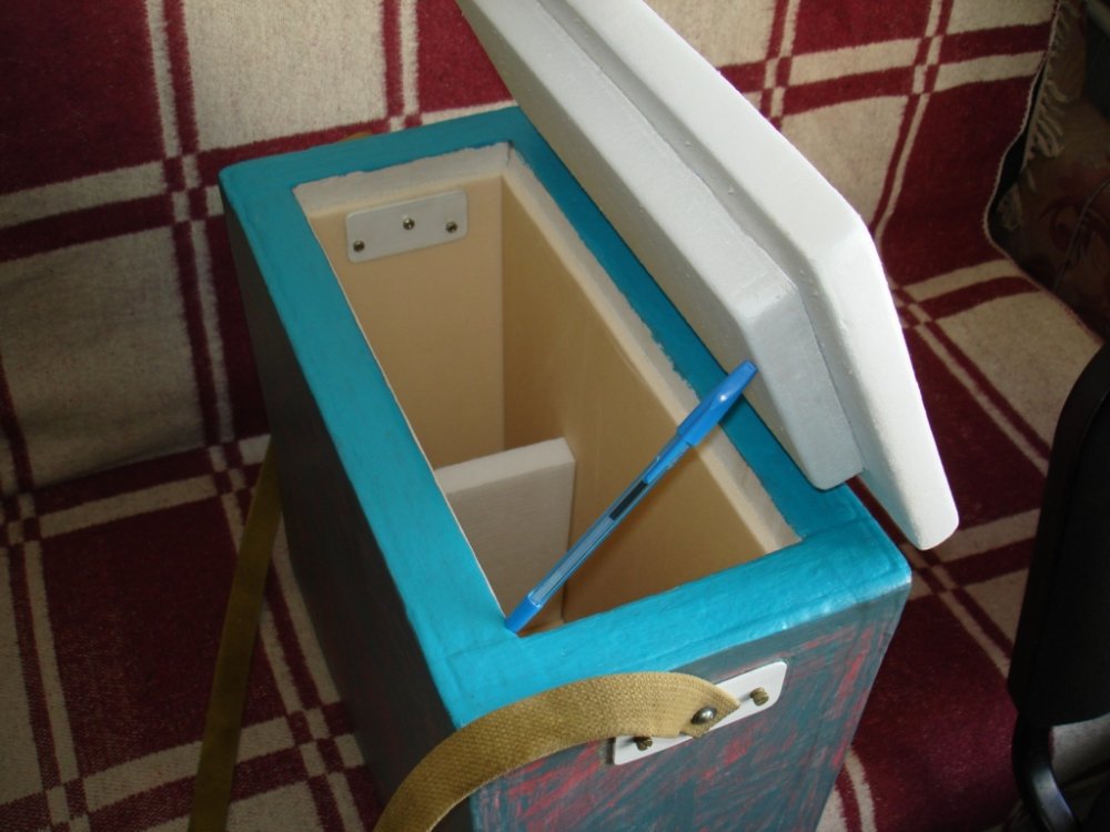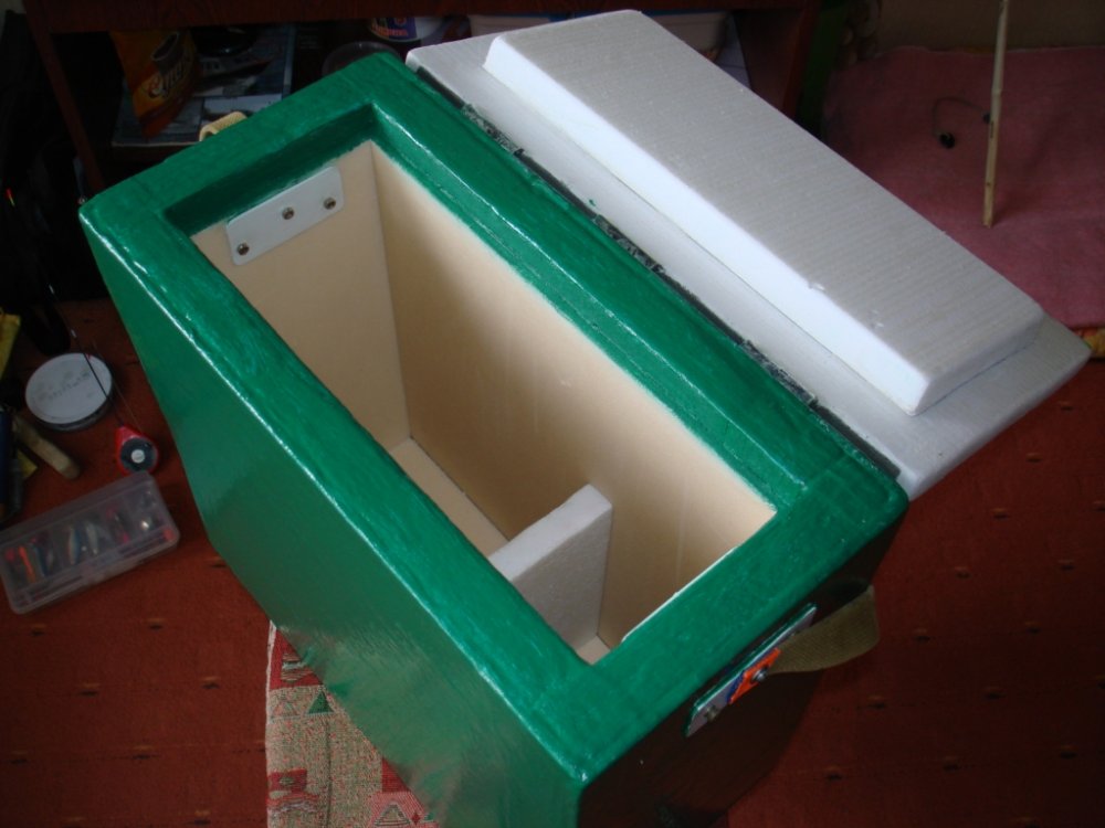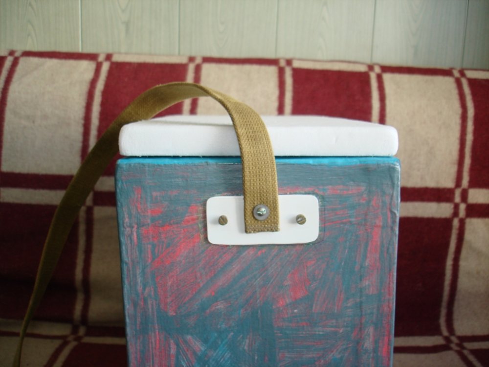и далее облагораживаем ящик -подгоняем ремень обклеиваем внутри тонким пенополистиролом на верх крышки садим лист тонкого полистирола-ящик практически готов