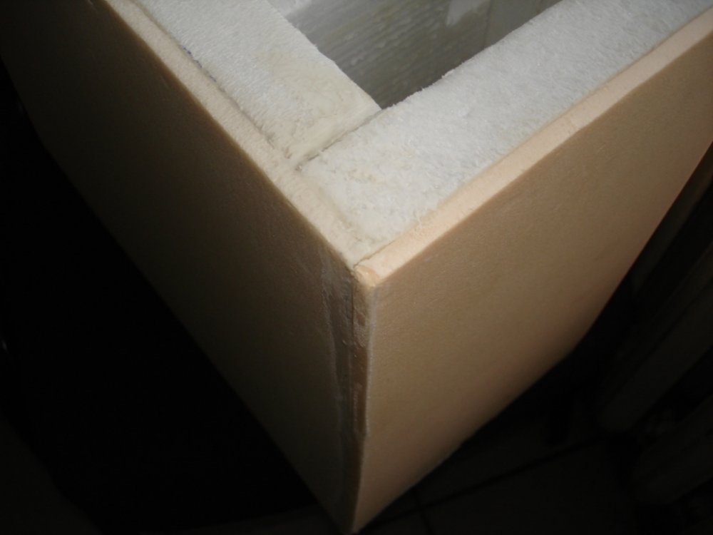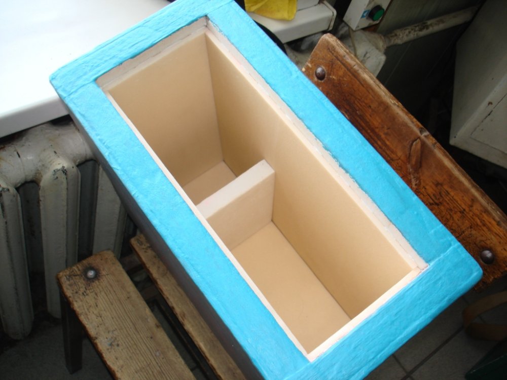 Делаем чертеж необходимого размера ящика и строго по угольнику вырезаем заготовки.Далее наносим на торцы силикон и собираем конструкцию-пока силикон не затвердел есть возможность корректировать.После оставляем на сутки для полного схватывания силикона.Далее вырезаем из тонкого пенополистирола внешнюю обшивку и внахлест швов клеим по сторонам на жидкие акриловые гвозди.