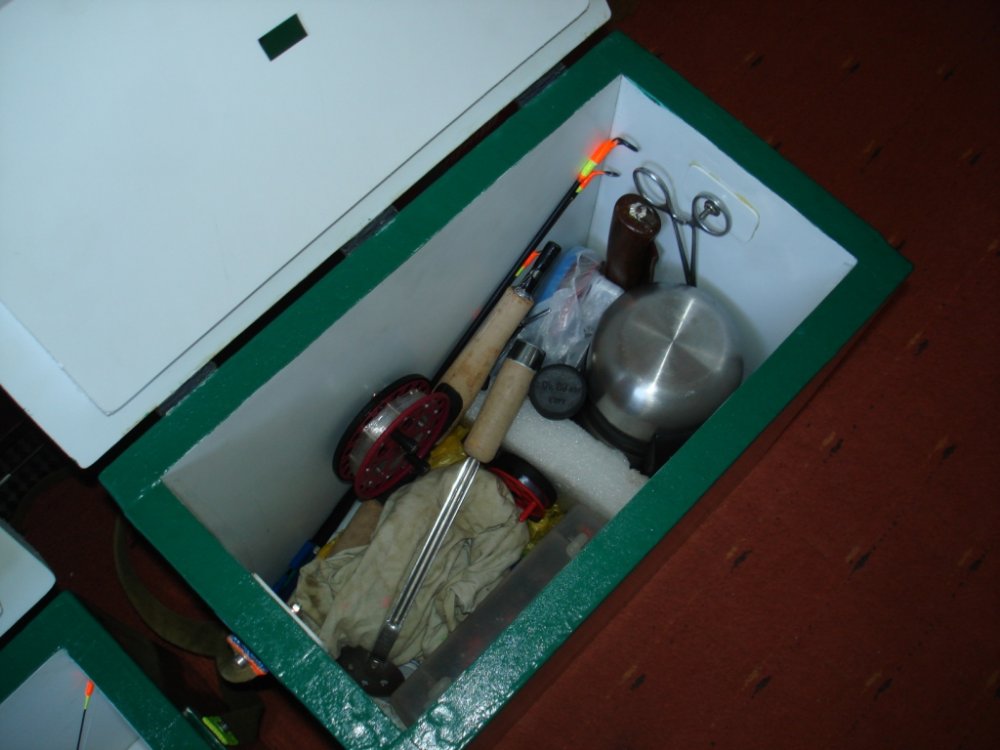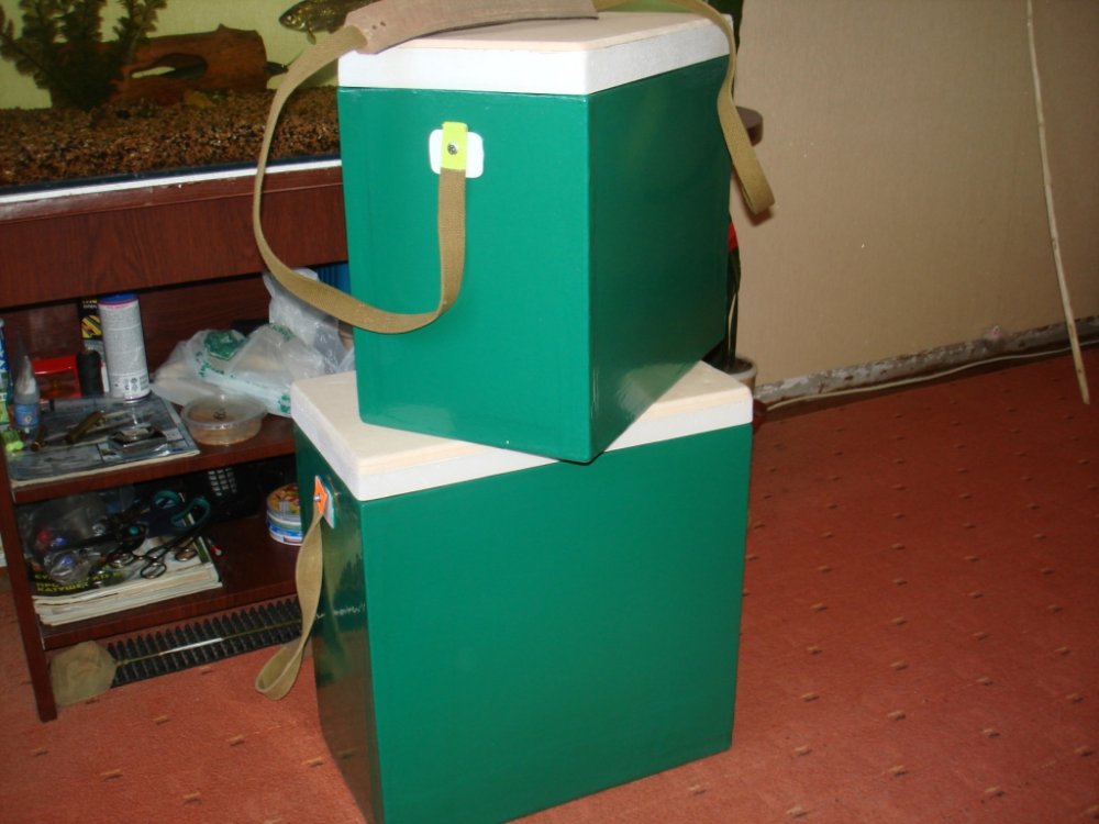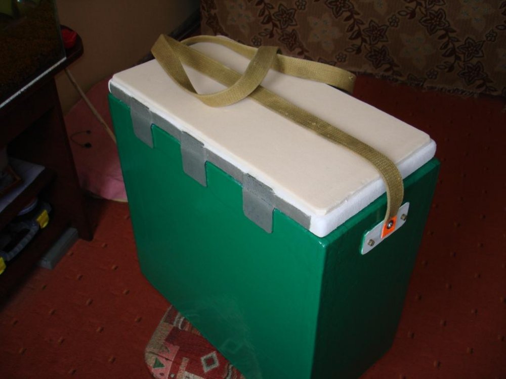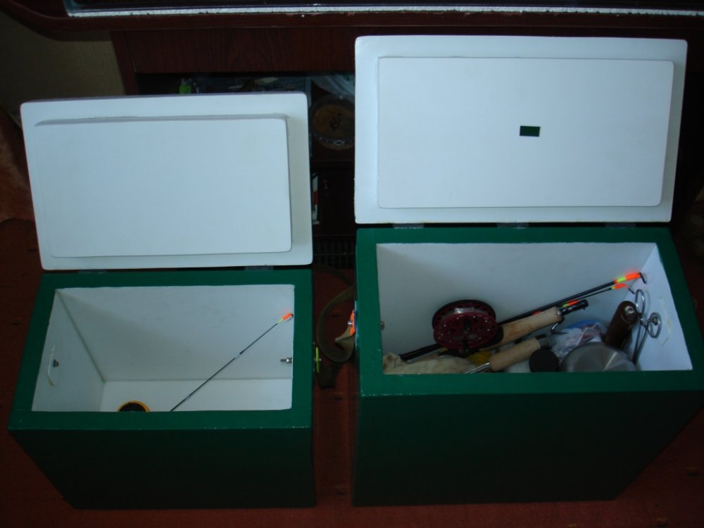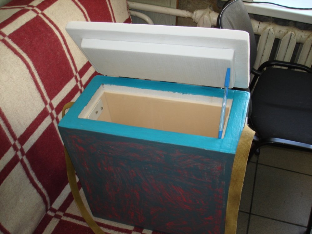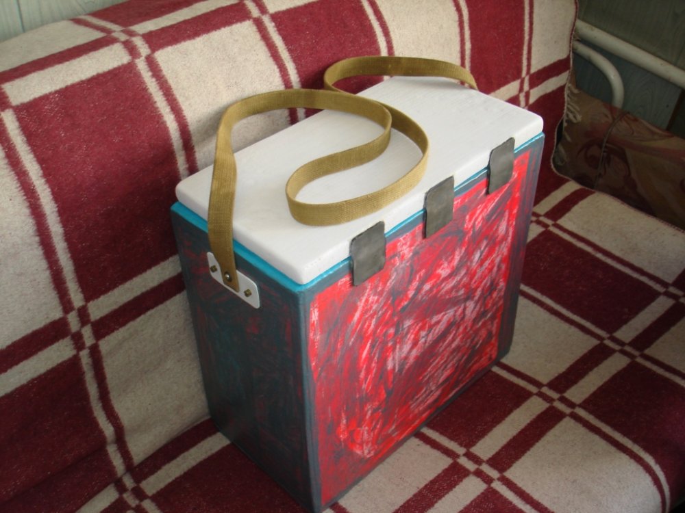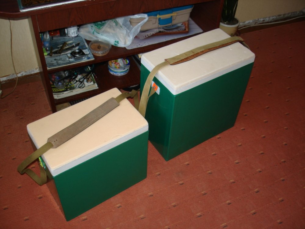 И в заключение скажу-сложного в изготовлении ничего нет-все из подручных материалов.Ящики прошли испытания и летом в жару и зимой на льду.Носить такой ящик гораздо легче стало-сидеть на льду удобно -единственный минус дно скользит -со временем приклею на днище тонкий лист резины-это снимет проблему.Снег и лед на этот ящик не примерзает- как на металический.Летом продукты целый день остаются прохладными как из холодильника.