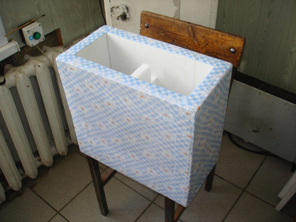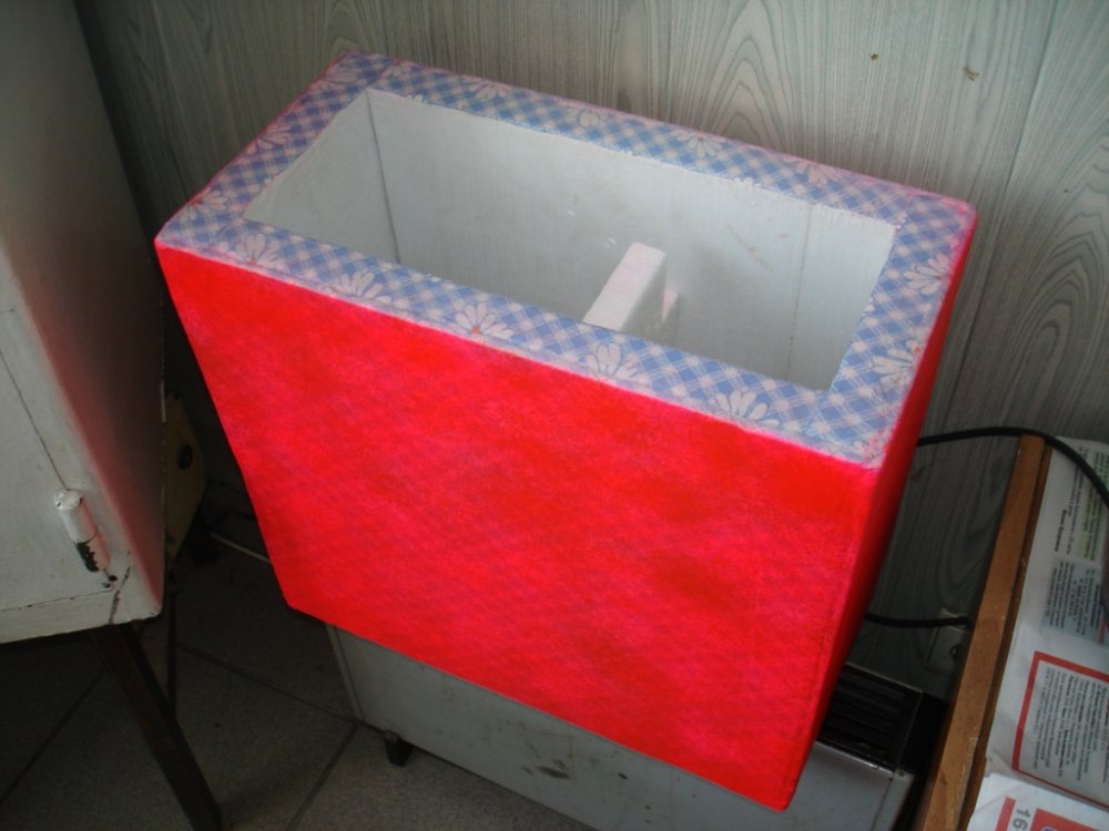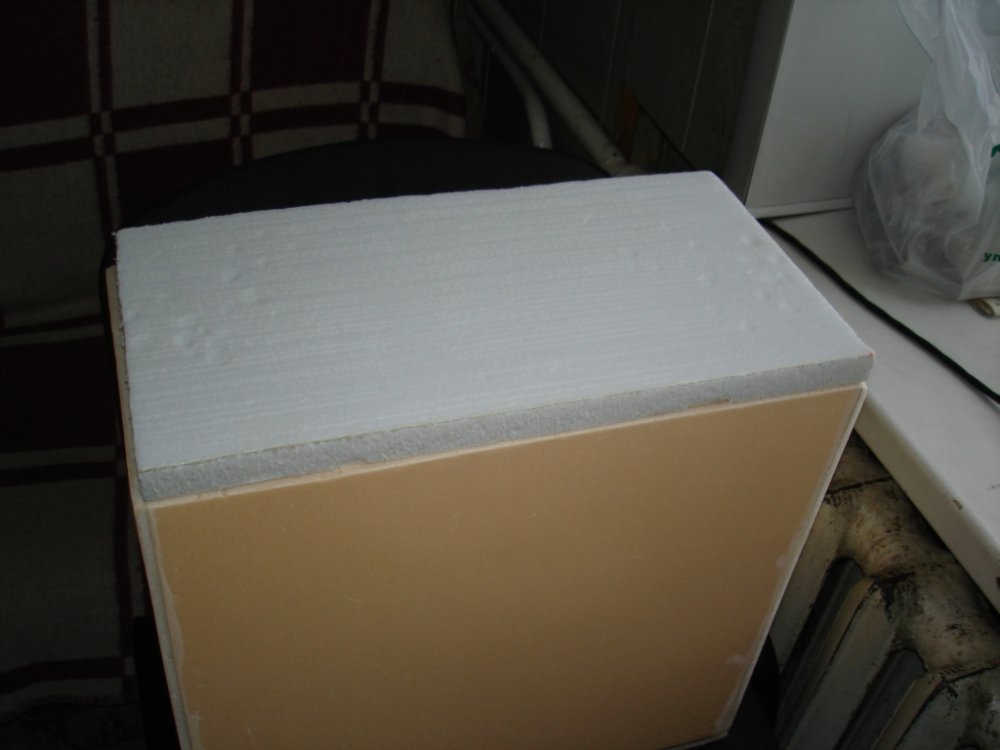 Изнутри оклеиваем ящик строительным утеплителем. Можно конечно обойтись и без него, но с ним согласитесь симпатичнее. И приклеиваем к крышке поролон.