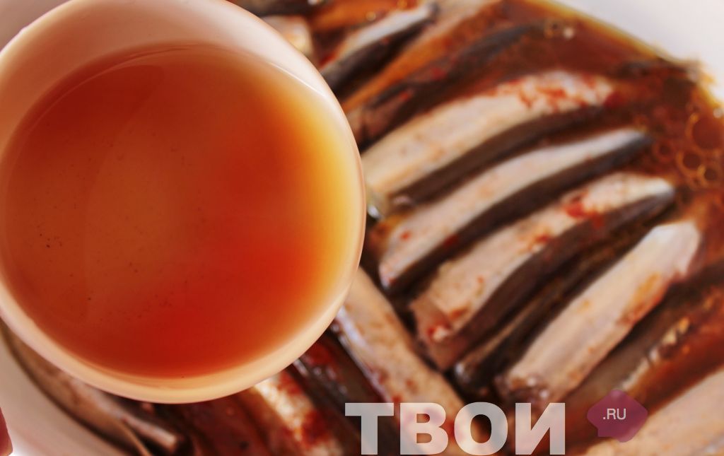 - Приготовьте крепкий чай и смешайте его с растительным маслом и уксусом. Полученной жидкостью залейте рыбку.