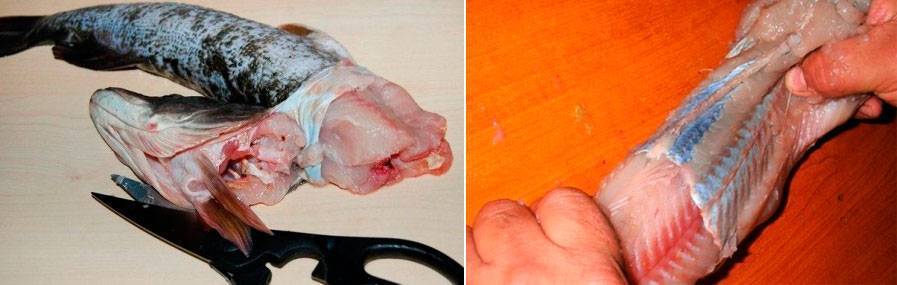 Пищевод вынимают вместе с жабрами, оставляя голову. Удаляют белую пленку, идущую вдоль брюха (она же плавательный пузырь).