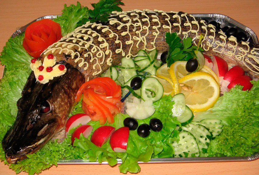 Слегка остывшую щуку нарезать на порционные куски и переложить дольками лимона и веточками зелени. Красиво разложить по краю блюда, по хребту нарисовать майонезом зигзаг, в центр можно высыпать баночку черных оливок — импровизация черной икры.