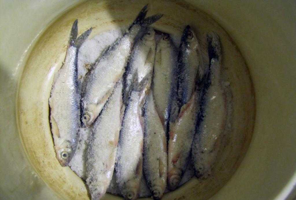 В первую очередь, на дно емкости насыпается сантиметровый слой соли, а затем рыба, при этом каждая рыбка тщательно натирается солью со всех сторон. Рыба укладывается так, чтобы оставалось как можно меньше свободного пространства. После каждого уложенного таким образом слоя, рыбу посыпают тонким слоем соли. После завершения процесса укладки, рыба сверху также засыпается сантиметровым слоем соли. В заключение, рыба накрывается крышкой с тяжелым грузом, при этом крышка должна давить на рыбу, а не просто закрывать емкость.