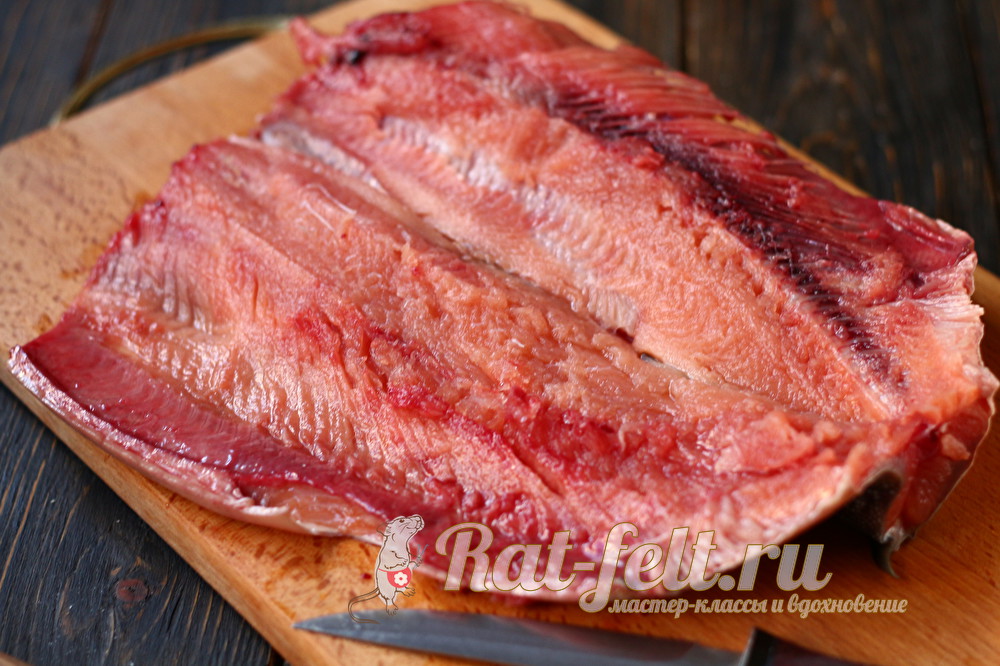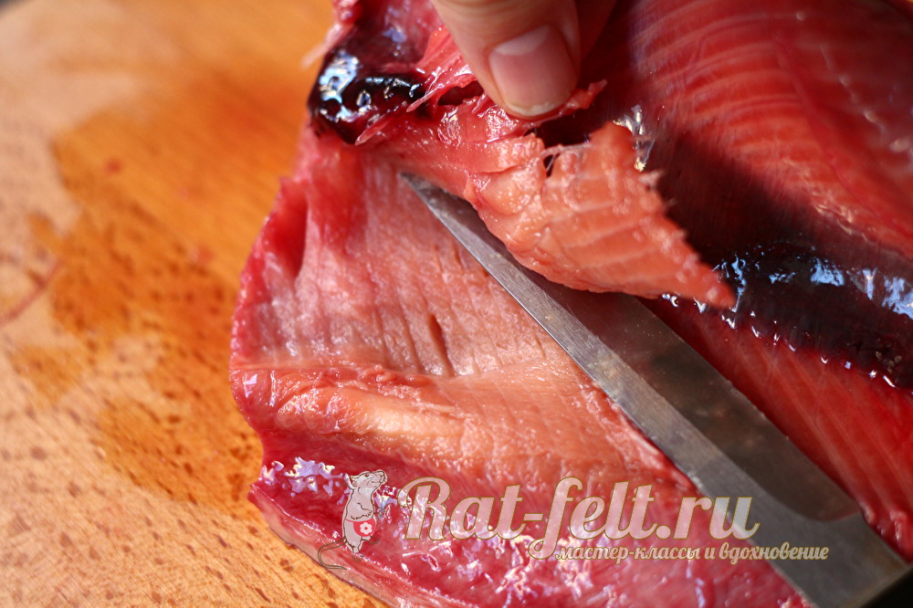 Это, пожалуй, самый ответственный момент. Во-первых, понадобится острый нож. Во-вторых, нужно поддеть им шкуру рыбы, после чего сделать по хребту глубокий надрез от головы до хвоста. После этого, этим же острым ножом мясо рыбы отделяется от костей как с одной, так и с другой стороны.