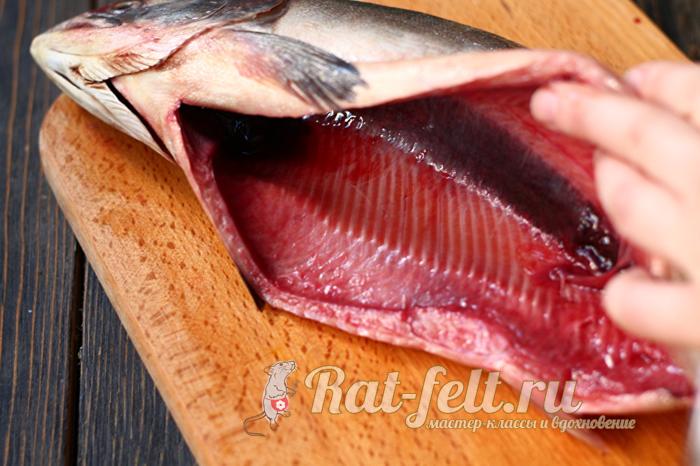 Раздвинув края, следует извлечь внутренности, стараясь не повредить желчный пузырь, его содержимое может испортить продукт. Если неприятность произошла профессионалы советуют немедленно засыпать место солью, после чего через пару минут тщательно промываем и очищаем участок филе.