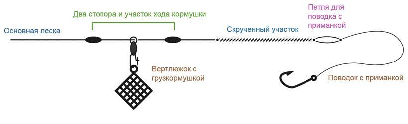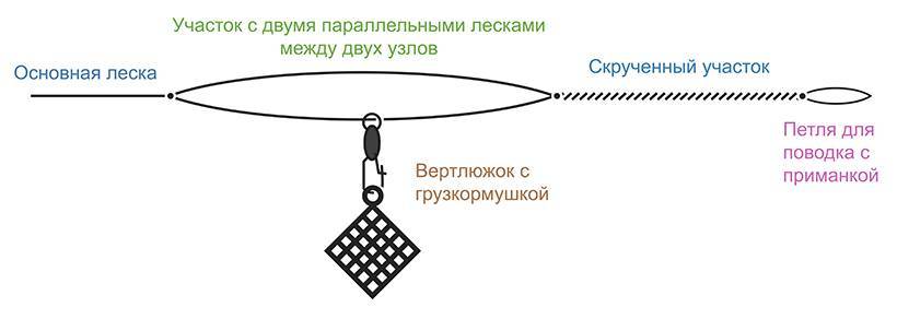 Этот монтаж состоит из следующих частей. К концу основной лески за маленькую петельку присоединена большая петля. К её второму краю присоединена скрутка длиной не менее 10 см. Это сделано таким образом, чтобы оба плеча большой петли имели равную длину. На одной из них при помощи вертлюжка прикреплена кормушка. У свободного конца скрутки имеется небольшая петля для присоединения поводка.