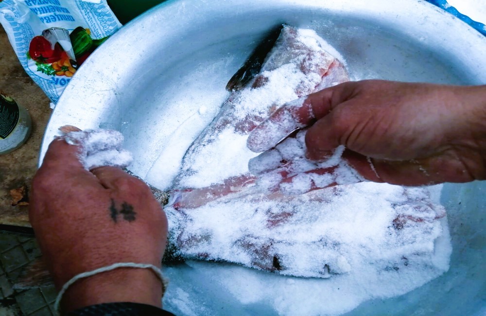 Перед засолкой рыба разделывается, с удалением чешуи, головы, хвоста и плавников, а также внутренностей. После этого, тушки рыбы тщательно промываются в проточной воде. Затем разделанная тушка ложится в соль полностью и помещается в холодильник на 2 часа.