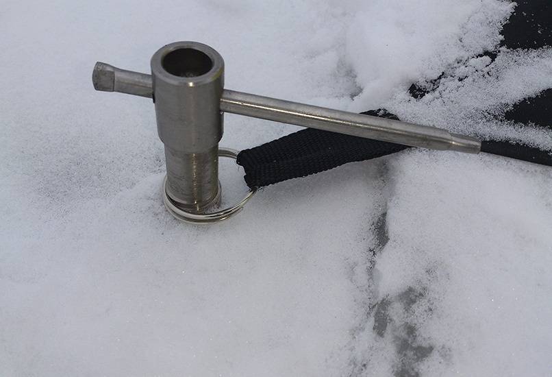 Чтобы шатер не сносило, он обязан быть капитально закреплен. Механизм крепления прост: в комплекте присутствуют специальные ввертыши, на которые надевается петля, пришитая к тенту. В таком положении буравчик вворачивается в лед. Иногда на конце петли есть металлическое или пластиковое кольцо, куда продевается колышек.