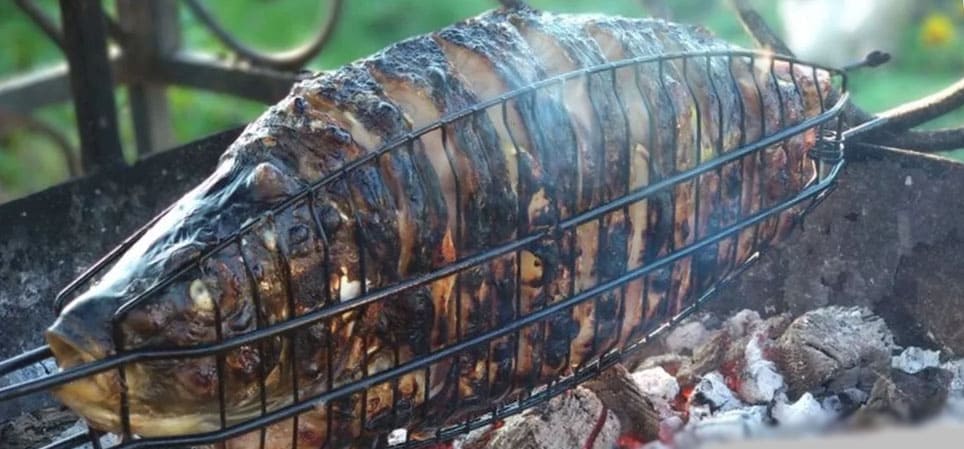 Чтоб приготовить карп на мангале, рыбу необходимо замариновать, а потом его можно просто пожарить в сетке.