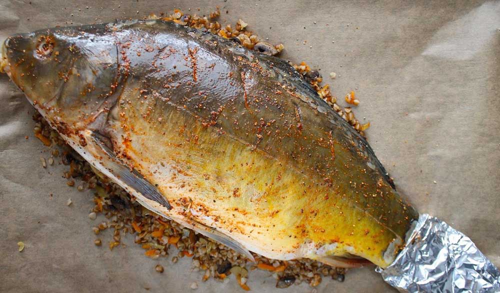 По-настоящему сытным и вкусным получается карп фаршированный гречневой кашей. Рыба отлично пропекается на мангале, мясо буквально само отслаивается от кости. Карп, запечённый по рецепту с гречкой, можно готовить без длительного маринования.