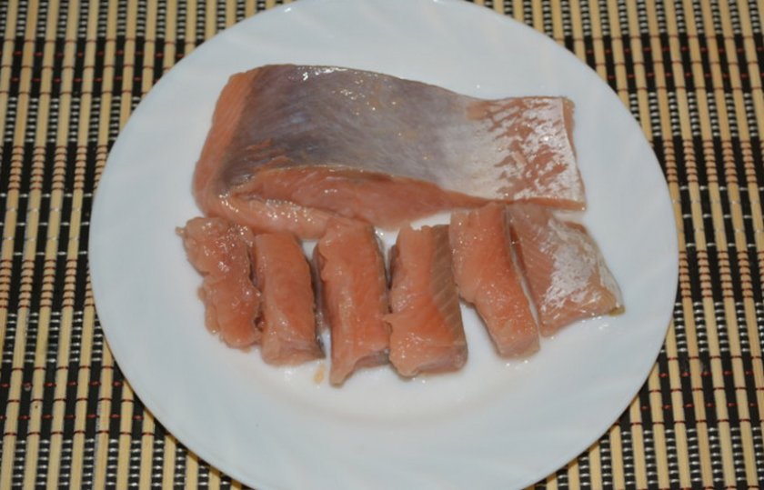 Вот у нас хороший кусок филе кеты. Первым делом вынимаем из него все кости, чтобы они не попадались потом в готовом продукте. Щупаем пальцем и если натыкаемся на кость — вытягиваем ее. На наше счастье кета не самая костлявая рыба, и вы быстро справитесь с этой задачей.