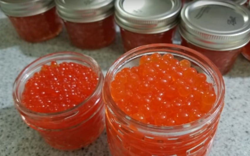 Соленая икра горбуши, приготовленная в домашних условиях, готова к употреблению