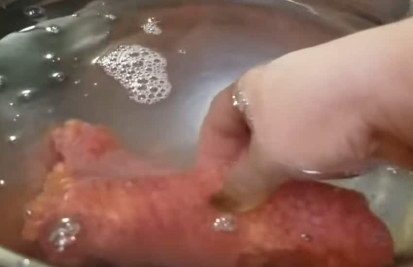 - Сложить марлю в несколько слоев. Выложить икру. Края сомкнуть. Включить воду в кране. Выбрать самый горячий режим. Подставить марлю с содержимым под струю и постоянно перемешивая икринки подержать пару минут.