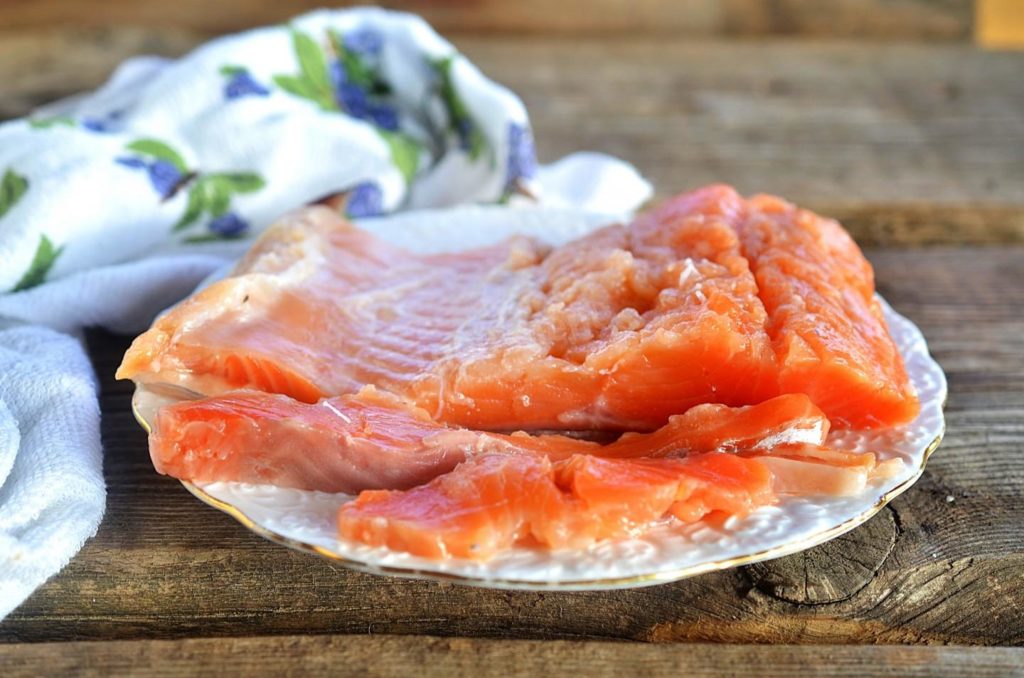 Для начала подготовьте красную рыбу: разморозьте и почистите. Если вам удалось купить целого лосося, то вы можете засолить его полностью (вместе с хребтом) или разрезать на куски-филе.