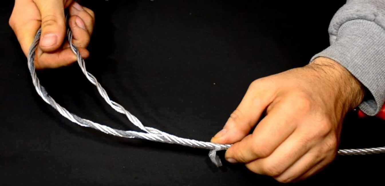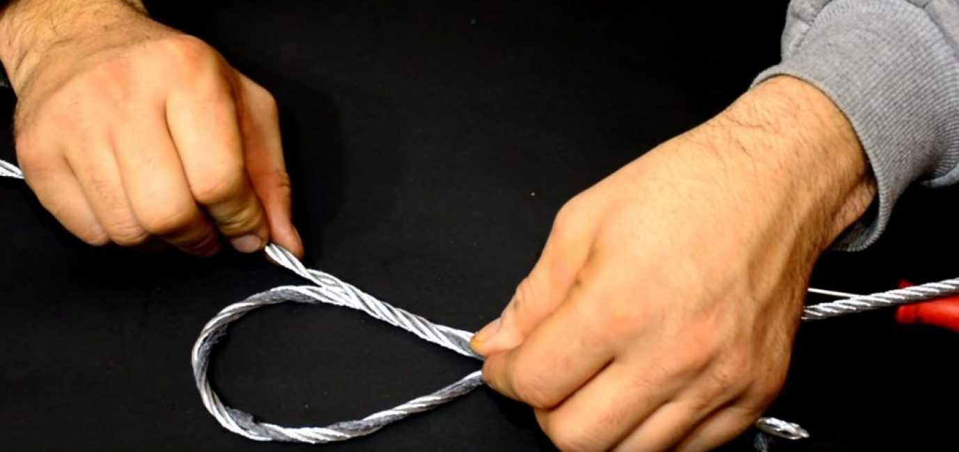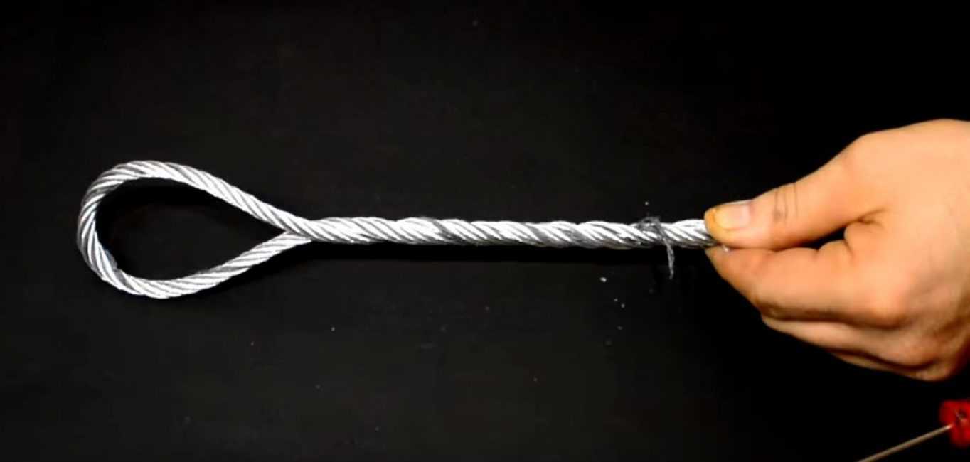 - Первым делом берут один конец троса рукой, затем сгибают его и перекручивают петлей.