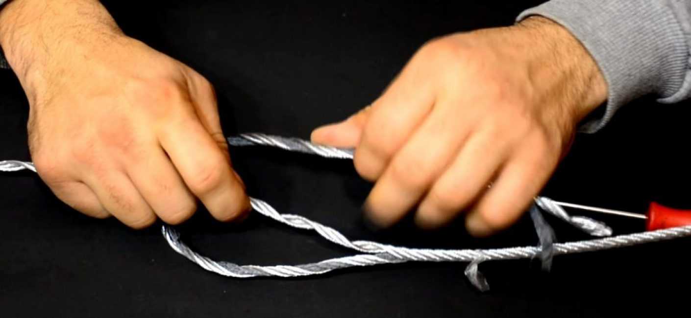 Трос необходимо расплести от его конца до сделанной отметки при помощи отвёртки. Сделать это достаточно просто. Обычно, трос состоит и 6 сплетённых нитей.