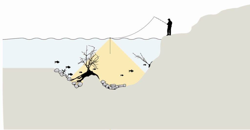 - небольшой радиус обзора, связан с размерами лунки так как лед не позволяет проходить лучам эхолота за его пределы и ограничивает обзор диаметром лунки.