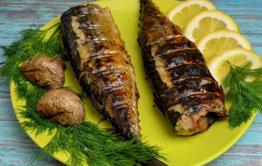 Чтобы разнообразить меню блюд на мангале, то часто используют скумбрию, её жарят на решётке. Для приготовления рыбу моют, отрезают голову, делают надрез на спине, вытаскивают хребет, разворачивают. Для маринада берут масло растительное, соль, перец, чеснок, зелень, горчицу. Маринуют 2-3 часа и жарят до готовности на решётке, в течении 10-12 минут. Подают с лимоном и зеленью.