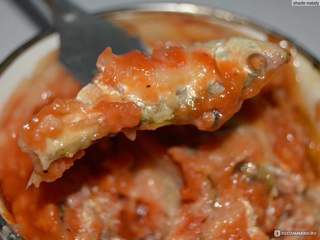 Потрошим рыбу, убираем головы, плавники, хвосты, промываем. Ставим скороварку на огонь, вливаем масло, отправляем туда рыбу. Отдельно в томатную пасту вводим горчицу, масло, соль, воду, сахар, вымешиваем, вливаем в скороварку. Закрываем крышку, встряхиваем, провариваем на среднем огне до появления пара, затем снижаем уровень огня. Готовим около часа, затем выпускаем пар, выкладываем полученную рыбную массу по прогретым банкам, стерилизуем на водяной бане вместе с крышками около 10 минут. Затем плотно закрываем, переворачиваем, накрываем теплым одеялом до остывания.