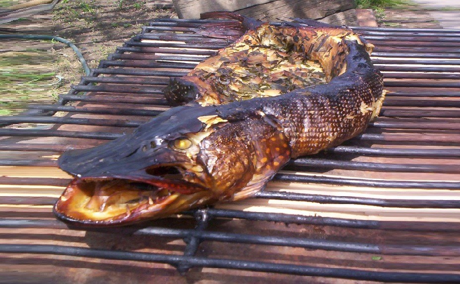 - Выкладывают тушки щуки на решетку, слегка свернув полукругом.