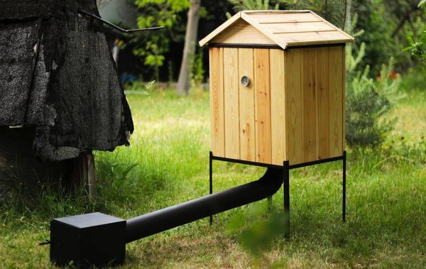 Более простым вариантом является установка коптильни на склоне холма и использование в качестве генератора дыма костра или небольшого очага. Дымоход изготавливается из канавы, выкопанной в земле, и накрытой шифером или листами металла.