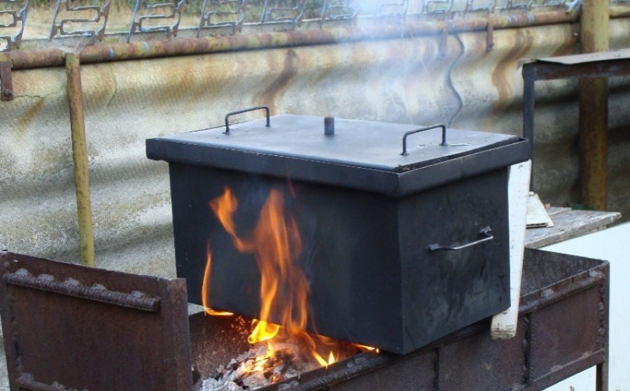 - Собирают коптильню: устанавливают внутрь поддон и решетки, баки ставят на кирпичные стенки. Накрывают крышкой или мешковиной.