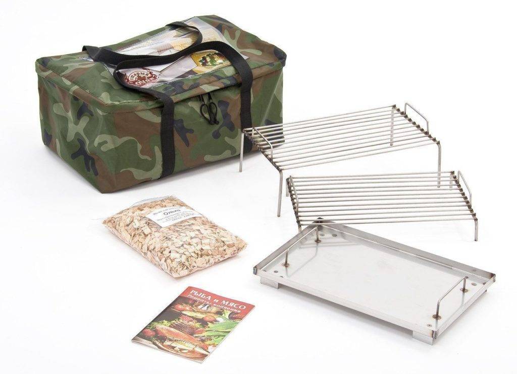 Простая конструкция коптильни для горячего копчения с толщиной стенок 1,5 мм, позволяет ей быть одной из самых недорогих в категории. Вес около 14 кг. Комплектность: две решетки, съемный поддон для жира, чехол для защиты от повреждений.