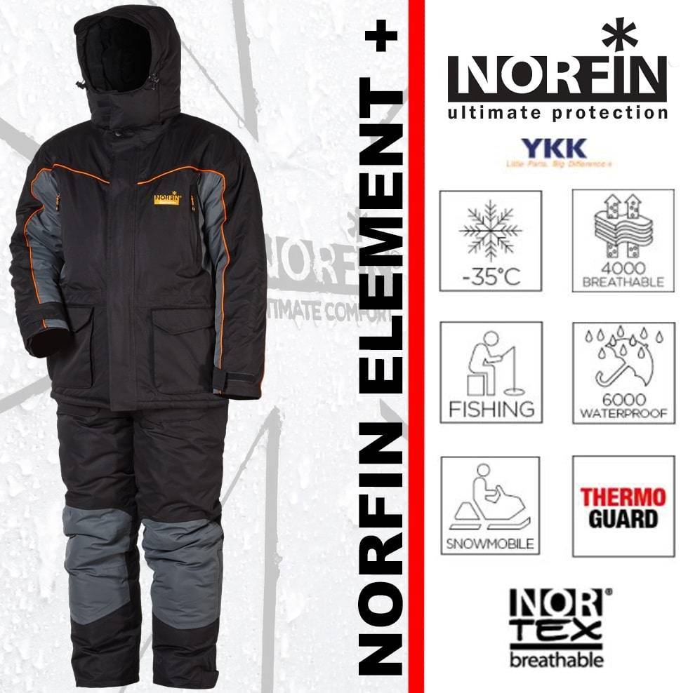 Бестселлером среди костюмов norfin для зимы считается Norfin Tornado. Это уникальный зимний костюм, который предназначен для эксплуатации в условиях холодной зимы, в период активного движения. Костюм можно использовать до -30, так как в качестве утеплителя используется тинсулейт. Это искусственный наполнитель, внутри которого имеется воздушное пространство, обеспечивающее хорошую теплоизоляцию. Куртка и комбинезон изготовлены из качественной мембранной ткани, которая покрыта прорезиненным слоем. Одежда защищает рыбака и охотника от проникновения влаги, промокания в условиях сильных ливней. Одежда отличается высокой водонепроницаемостью, которая равна 10 000 мм. Кроме того, комплект одежды позволяет телу дышать во время активного движения из-за высокого показателя паропроницаемости. Качественный пошив, проклеенные швы, а также наличие большого количества дополнительных карманов, облегчают жизнь рыбака или охотника. В костюме есть нагрудные флисовые карманы для согрева рук. Есть водонепроницаемый карман для хранения смартфона с прозрачной поверхностью. Это позволяет пользоваться телефоном, не вынимая его из кармана. Великолепный выбор для активных людей, которые не сидят на месте и предпочитают активную зимнюю рыбалку, охоту в тяжёлых погодных условиях.